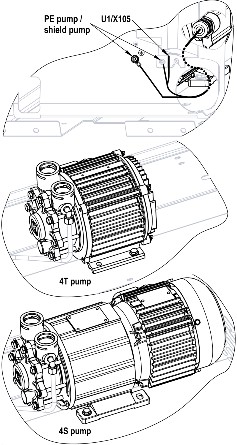 • 周波数変換器 (U_1) の接続X105を再接続し、接地線を電気ハウジングに固定します
