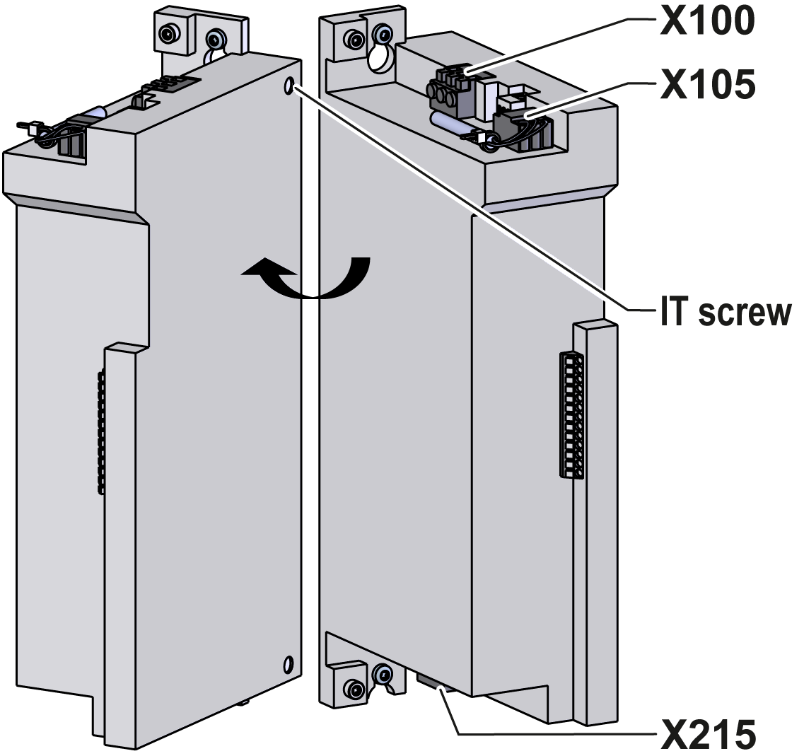 - Caracteristică specială a sistemelor IT (conexiune de alimentare fără pământ de protecție): Șurubul condensatorului la intrarea convertizorului de frecvență (șurubul IT superior) trebuie îndepărtat.