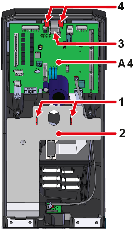 • 将 GIF-61 (A_4) 设备主板的安装带 (④) 向外推。 现在可以将棋盘抬出来然后向后折叠
