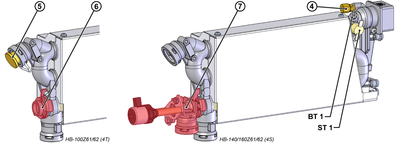 - HB-100Z61/62: Verschlussstopfen mit Montageklammer ⑤ sowie Deckel mit Befestigungsschraube ⑥ entfernen und auf die neue Heizung übertragen.