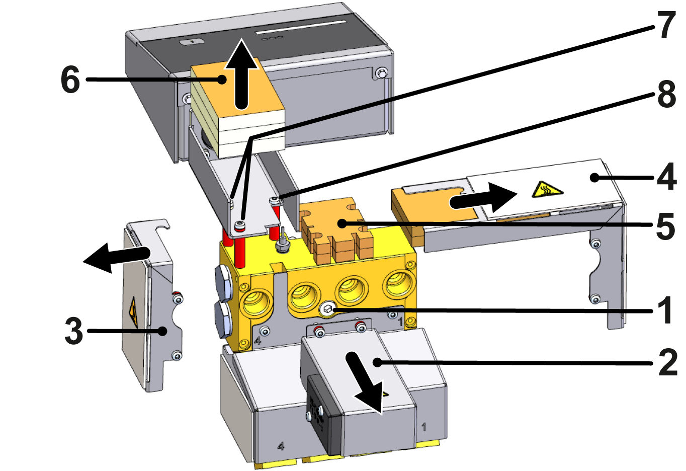 • Odskrutkujte skrutky Torx (⑦, ⑧) vrátane dištančných vložiek a PEEK rúrok (označené červenou farbou).