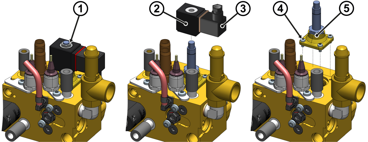 - Umiestnite elektromagnetickú cievku so zátkou ventilu na teleso ventilu ②.