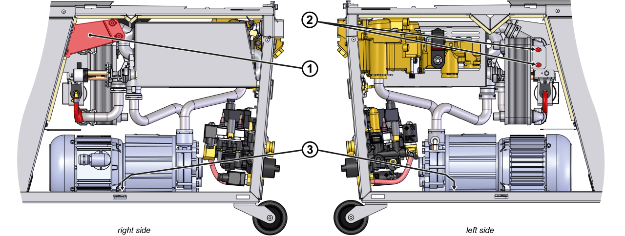 - Снимите крепежные винты радиатора и насоса ②, ③.