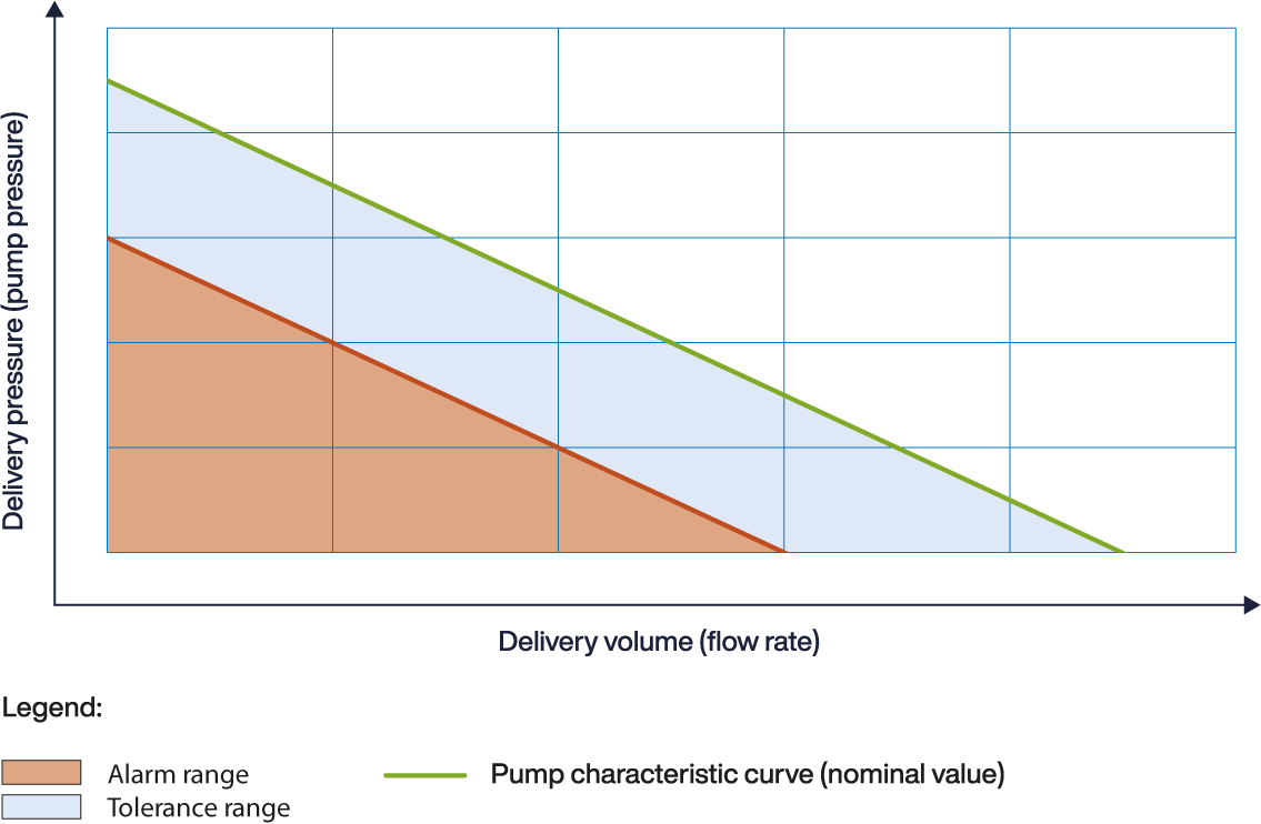 Sūkņi temperatūras kontroles ķēdēs ir pakļauti ekspluatācijas nodilumam. Darbības laikā stāvoklis, sūknis uzraudzība agrīnā stadijā konstatē caurplūde samazināšanos nolietojuma dēļ. Sūkņa stāvokli aprēķina procentos, pamatojoties uz izmērītajām Vērtības un konfigurētiem raksturlīknes Dati. Ja vērtība nokrītas zem iestatītā ierobežojuma, kas pēc noklusējuma ir iestatīts uz 60%, ierīce parāda apkope ziņojumu un parāda to ar brīdinājuma simbolu pamata ekrāns. ![]()