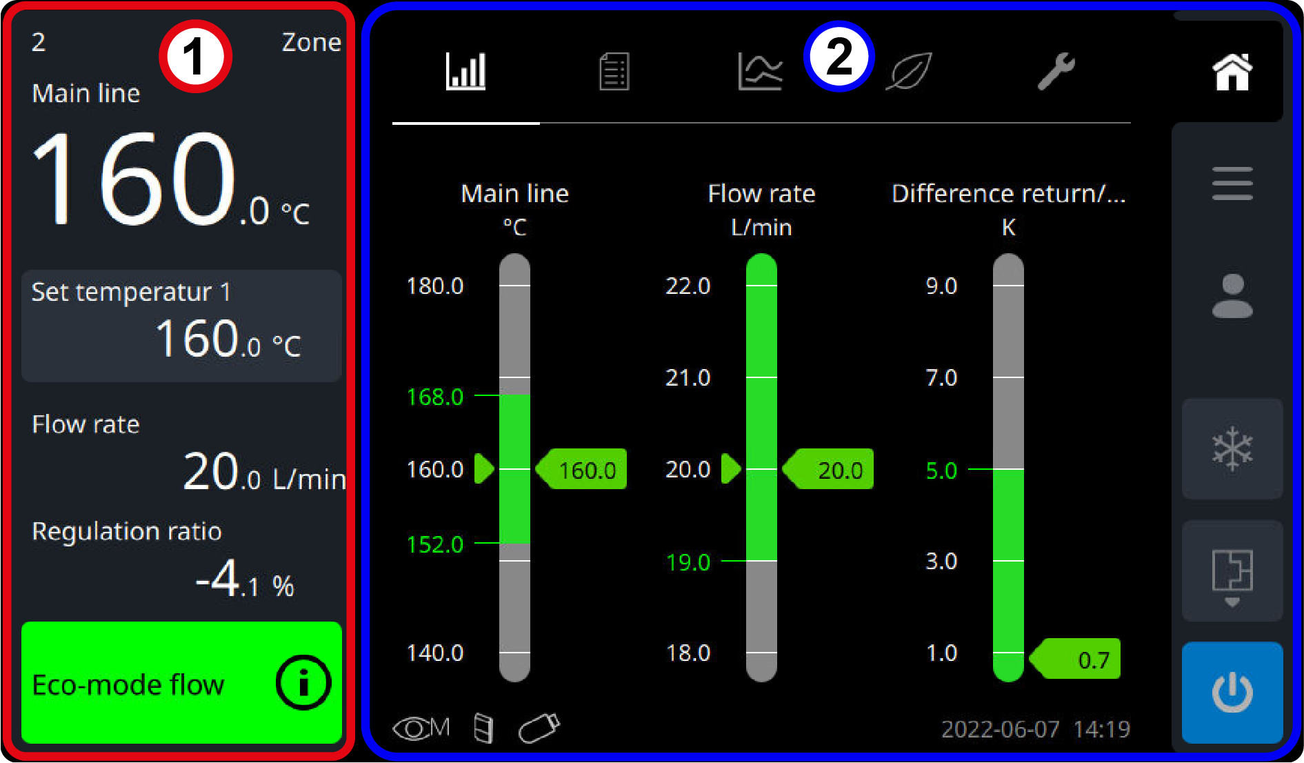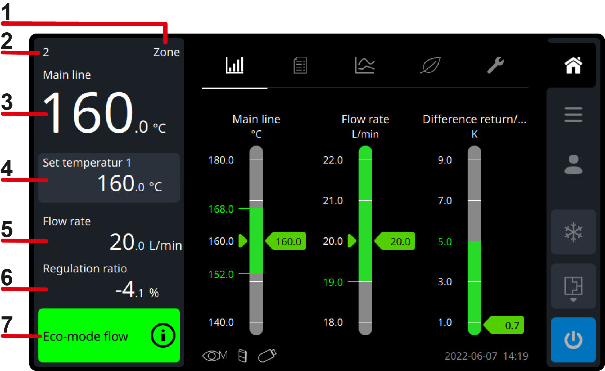 | Skutočná hodnota Zobrazenie ako indikátorový graf Skutočné hodnoty teploty (Výstup z prístroja, Spiatočka do prístroja alebo externe), prietok a rozdiel medzi Preposielaním a Prevíjaním dozadu sú graficky zobrazené ako indikátory. Okrem toho sa zobrazujú aj nastavené limitné hodnoty a cieľové hodnoty.