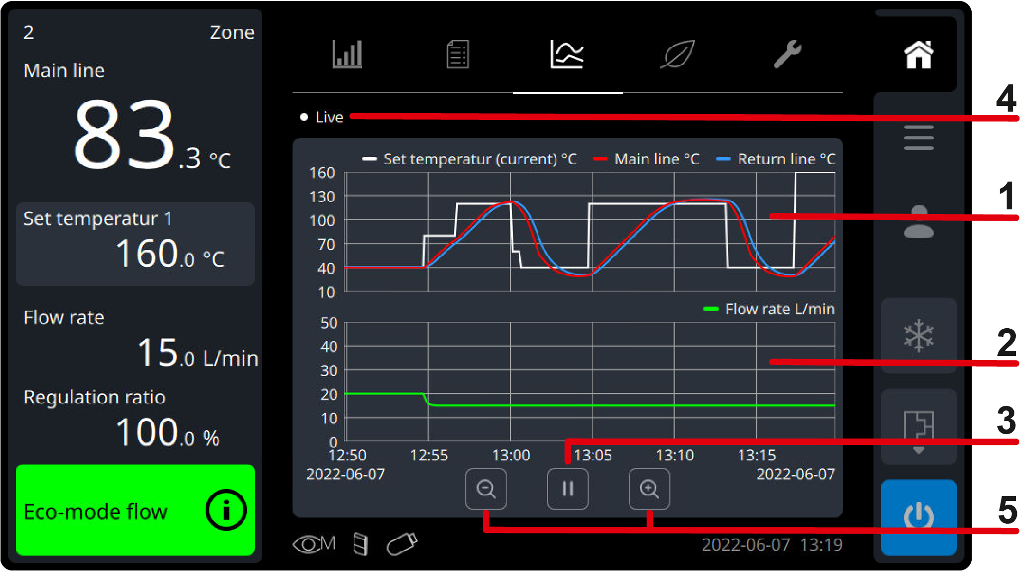 En la pantalla básica, debajo del símbolo de registro (), el registro de los valores de medición predefinidos para la temperatura y el caudal se muestra como un gráfico de tendencias.