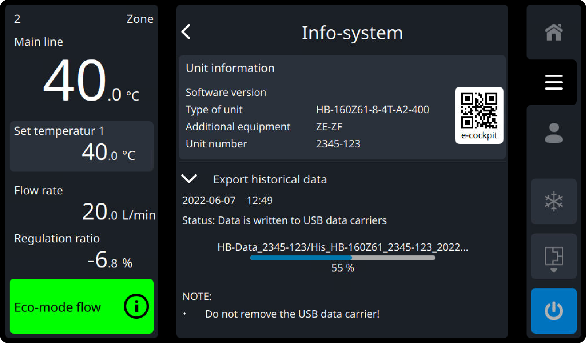 Protsessi käivitamiseks puudutage [Ajaloo Andmete Eksportimine] parameeter ketta ikooni (). → Andmed kirjutatakse USB-andmekandjale ZIP-failina. Infosüsteem avatakse automaatselt ja kuvatakse praegune edenemine (→ joonis). Lisand on protsess näidatud põhilisel ekraanil andmekandja sümboliga, mis vilgub kollane (). → Kui andmeedastus on lõpule jõudnud, teavitatakse sellest kasutajat ja näidatakse andmekandja valge sümboliga ().