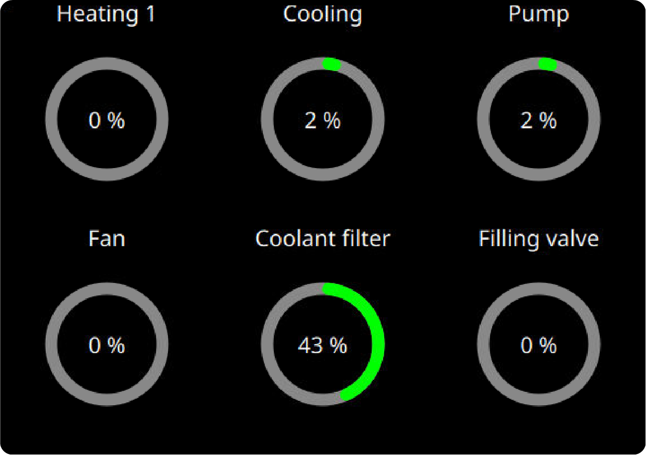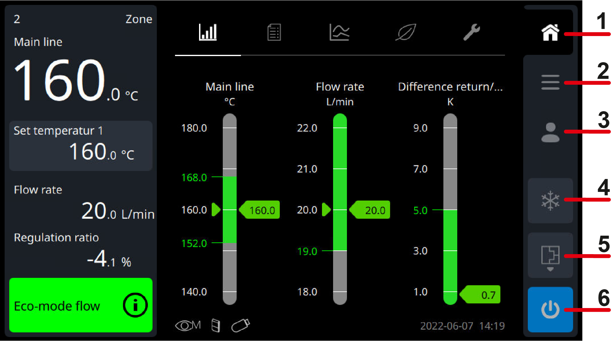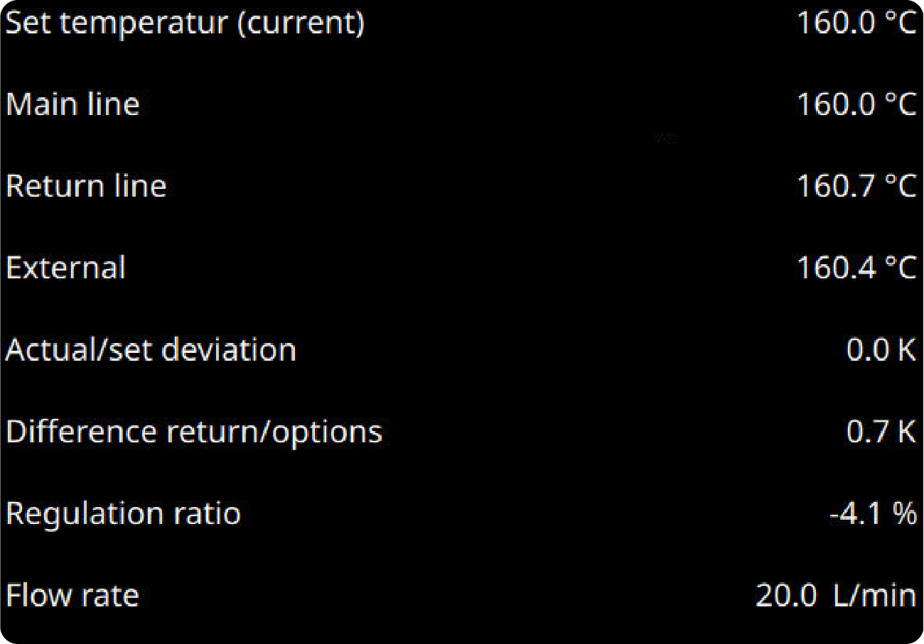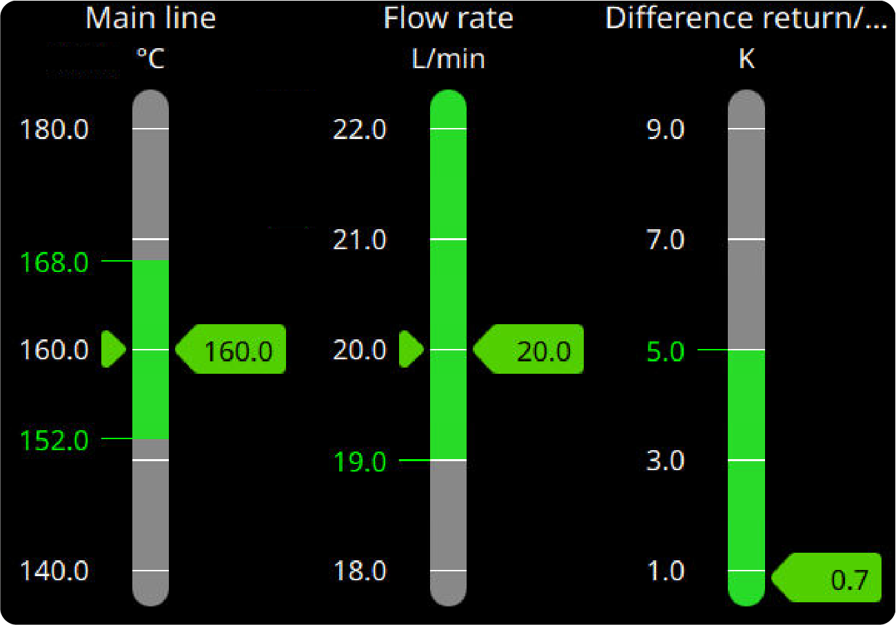 | faktinė reikšmė Indikatorius kaip indikatoriaus grafikas Faktinės temperatūros vertės (Ištek. rež., grąžinimas arba išorinis), srautas ir skirtumas tarp Ištek. rež. ir grąžinimo rodomi grafiškai kaip indikatoriai. Be to, taip pat rodomos nustatytos ribinės vertės ir norminės reikšmės.