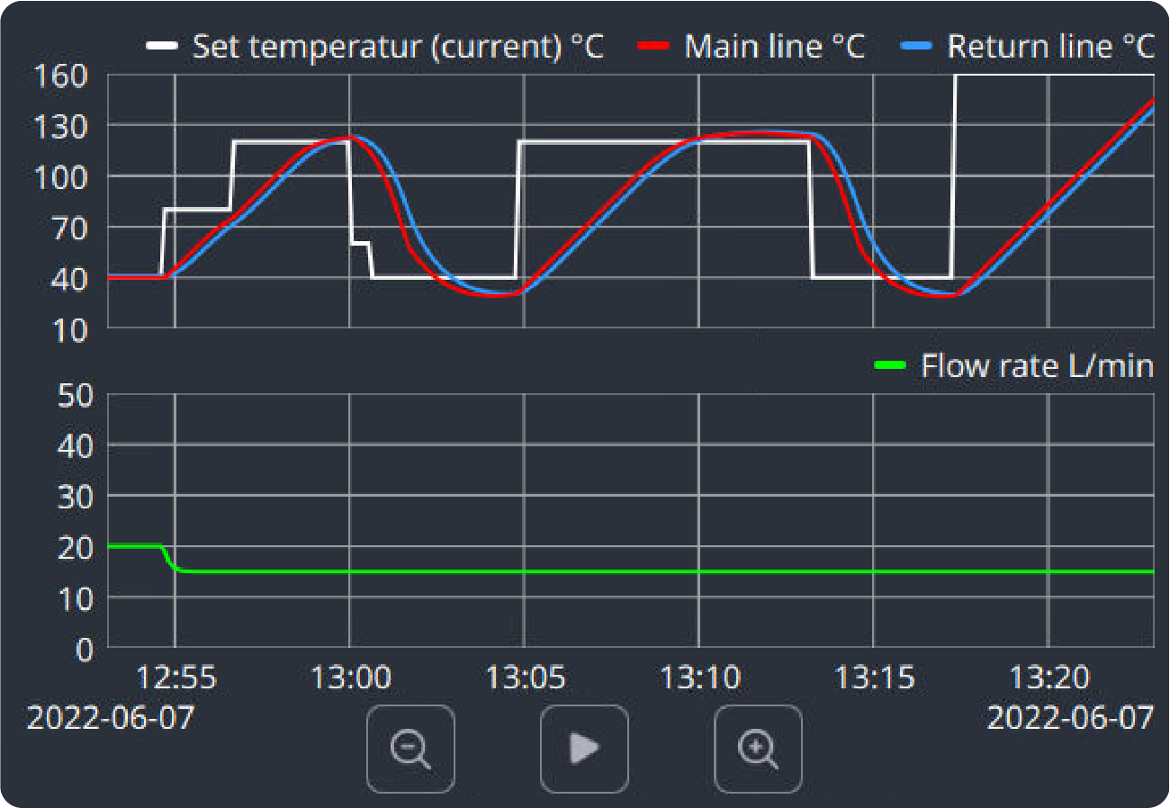 | Temperatūros ir srautas tendencijos grafikas Iš anksto nustatytų temperatūros verčių ir srautas matavimo verčių registravimas grafiškai rodomas ir nuolat registruojamas. Įrašą galima peržiūrėti atgaline data standartiniame Indikatorius gedimo diagnozei nustatyti arba išsaugoti kaip USB įrašymą USB Duomenys laikmenoje (→ spustelėkite čia... ). |
