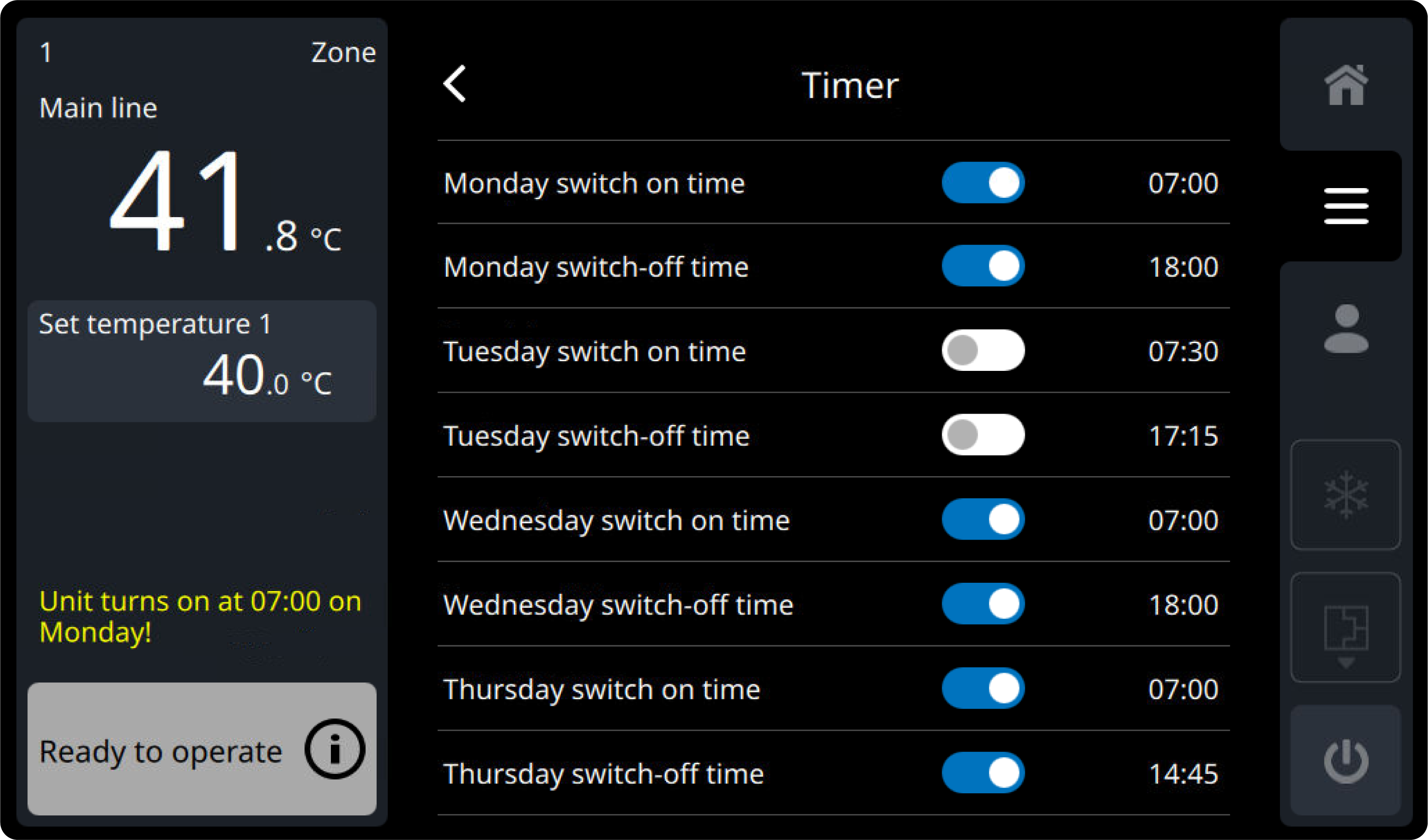 Kai laikmatis yra aktyvi, pagrindiniame ekrane rodomas simbolis (), o įrenginys įsijungia arba išjungiamas pagal nustatytą perjungimo laiką. Jei įrenginys yra išjungtas (paruoštas eksploatavimui) ir įjungtas bent vienas įjungimo laikas, pasirodo geltona įspėjimas, kuris informuoja, kada įrenginys bus įjungtas.