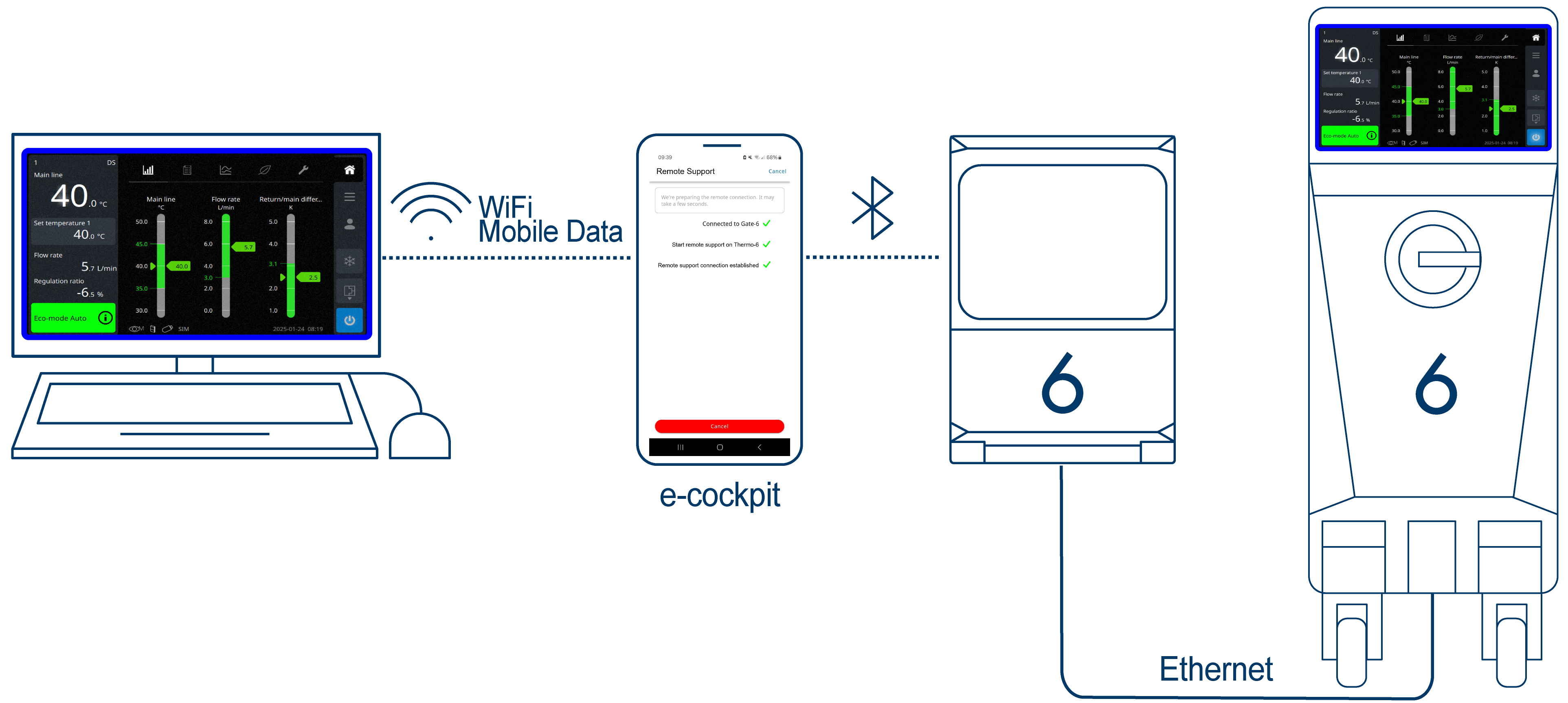 | Дистанционно поддръжка (изисква се регистър) Дистанционно поддръжка опростява анализа на проблемите и разрешаването на проблеми, като дава на HB-Therm Support отдалечен достъп до устройство (например HB-Therm Switzerland Support Team, Екип за Поддръжка от клона на HB-therm или представител). Прехвърлянето на Данни се извършва чрез Bluetooth чрез виртуална частна мрежова VPN връзка.
