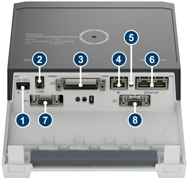 - 24 VDC 接続(+ = 24 VDC; – = 0 VDC;