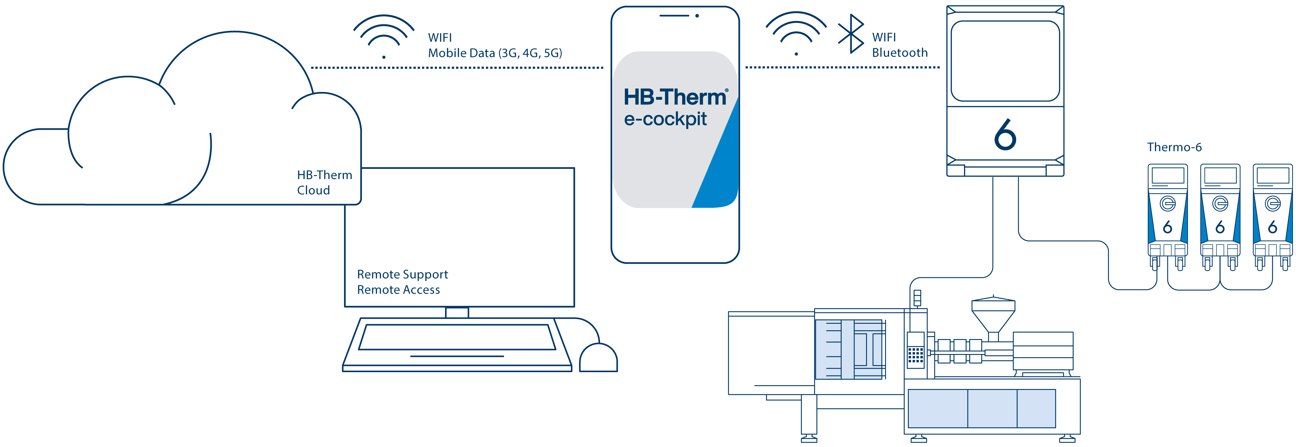 Com um servidor de interface Gate-6 conectado, o aplicativo e-cockpit permite acesso local a ele e às unidades de controle de temperatura Thermo-6 conectadas a ele via Bluetooth. Para que a comunicação funcione, o smartphone ou tablet deve estar dentro de um alcance máximo de Bluetooth de 10 metros (com visibilidade desobstruída). Para quantidades maiores de Dados, o aplicativo muda automaticamente para Wi-Fi para garantir uma transmissão estável e rápida.
